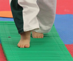 This can be described as the sense of how much space one’s body occupies and the ability to move comfortably around other objects and people. If you have taught this age group before you will understand that bumping in to things and each other are just part of their development. In fact, we seem to have at least one child a year run in to one of the walls in our training room. We purposely put our mats in a frame so the mats don’t fit all the way up to the wall to discourage the children from getting too close to the walls. At a later date we may consider matting the walls but from past experience of having a couple of crash mats fastened to one of our walls, this can actually encourage them to run in to the wall.