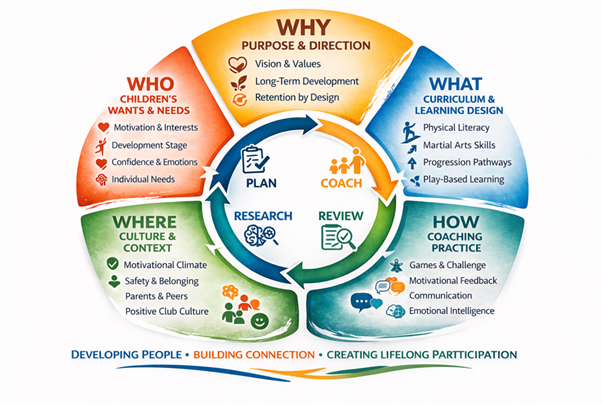 It provides a simple structure to help martial arts coaches move beyond teaching techniques and towards designing sessions that build connection, competence and long-term motivation in the children they teach.